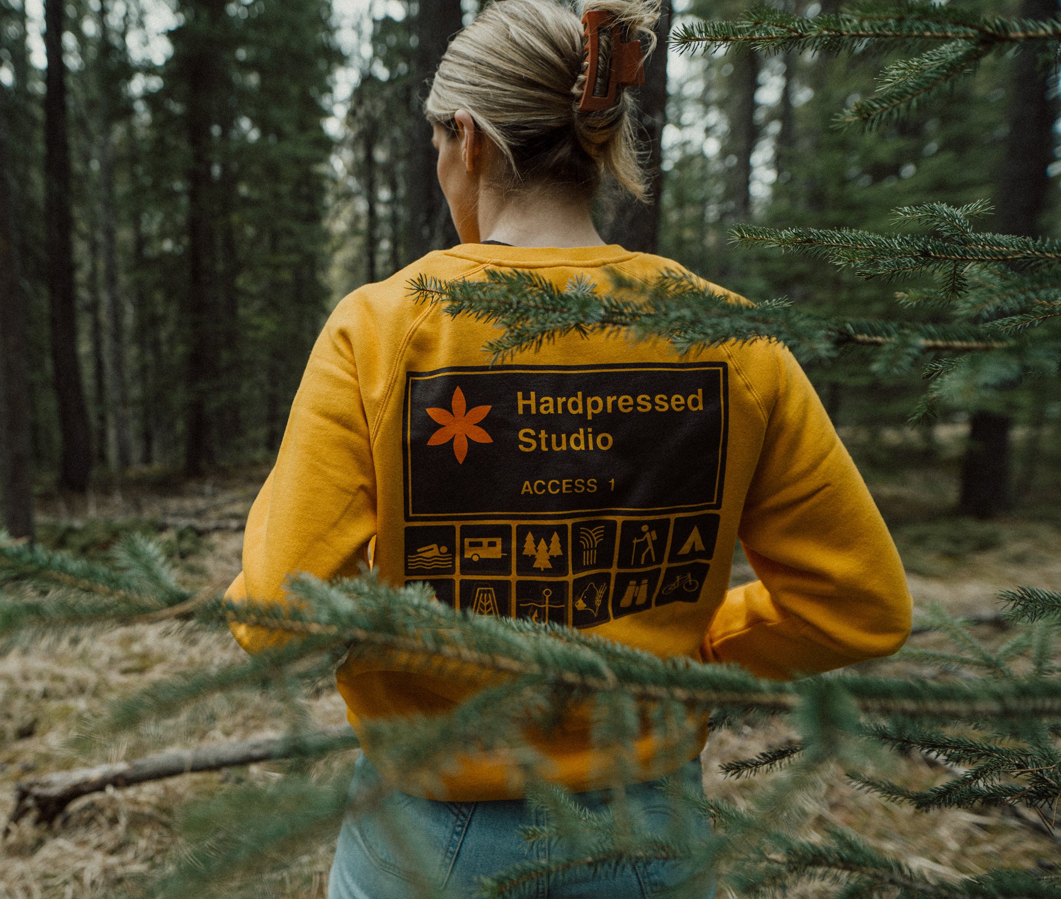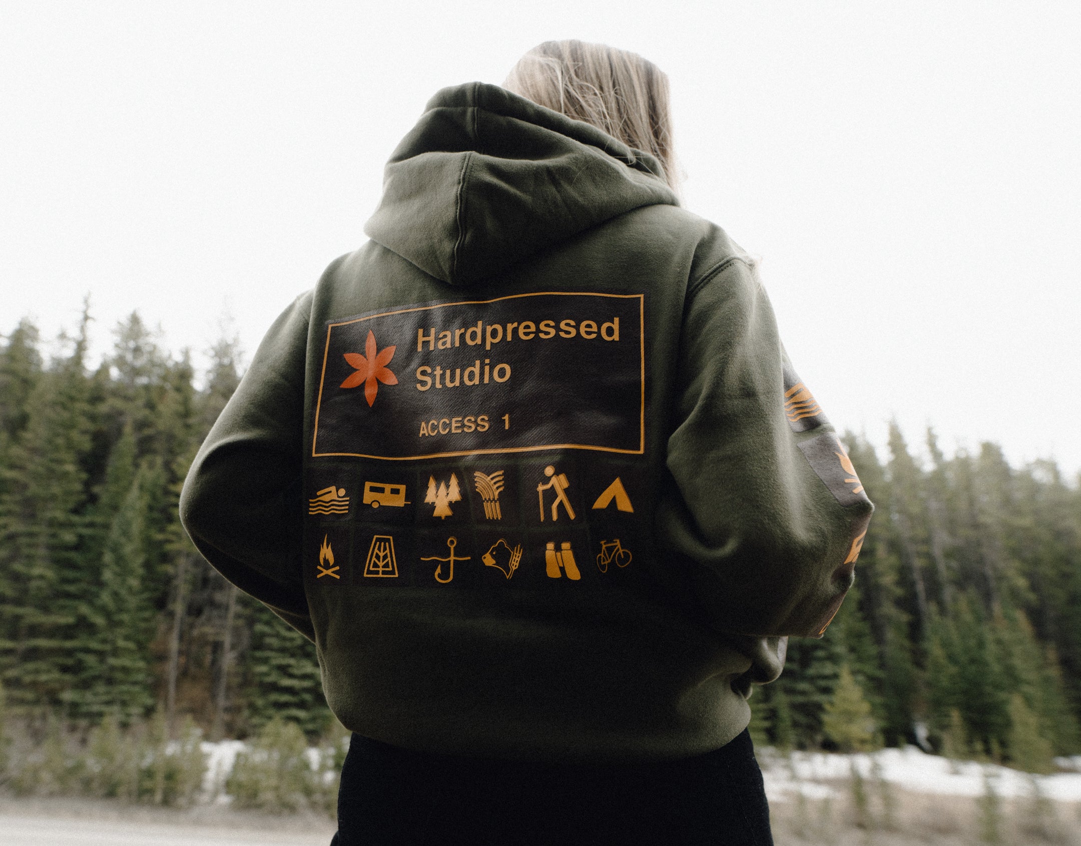 The Camp Series draws inspiration from the classic brown and gold provincial park signs that guide us into our favourite camping spots. It's a welcome sign at the end of a long road trip and immediately sets a slower pace as you return to nature. Released every summer for a limited time, this collection has become second nature for us at Hardpressed, just like pitching a tent the moment the snow melts.